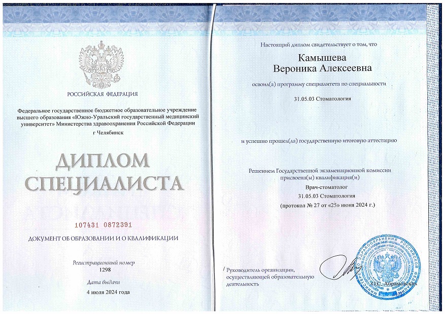 Камышева Вероника Алексеевна — детский стоматолог-терапевт клиники Вэладент Джуниор. Проводит лечение кариеса, пульпита или их осложнений. Вероника Алексеевна помнит об уязвимости детских зубов, поэтому уделяет особое внимание рассказу о профилактике заболеваний полости рта и дает понятные рекомендации по сохранению белоснежной и здоровой улыбки. Если дети встревожены, она старается рассказать о каждом этапе лечения и показать, что это не страшно и не больно. Мастерство Вероники Алексеевны и разные методы обезболивания помогают ей в этом.